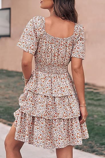 Women's Floral Summer Short Dress Square Neck Short Sleeve Tiered Ruffle Boho Swing Dresses