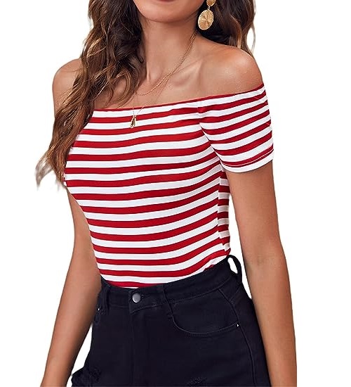 STYLE: Short sleeve shirts for women with dressy boat neck, relaxed tight fitted top, sexy off shoulder design, vintage plain color and french striped retro style womens clothing.