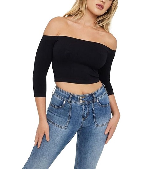 Women's Off Shoulder 3/4 Sleeve Top Tees Sexy Slim Fitted Ribbed Knit Crop Shirts