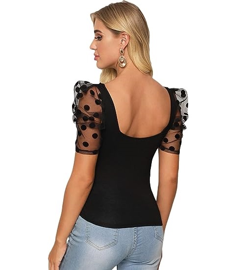 Women's Sweetheart Neck Mesh Puff Sleeve Slim Fitted Tee Top