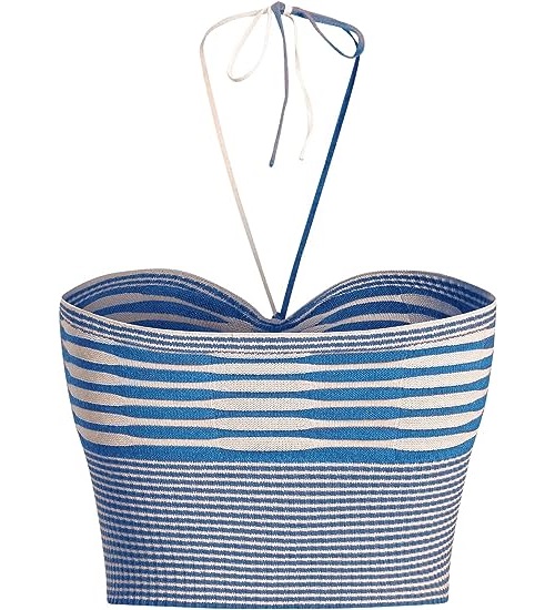 Sleeveless, tie back, backless, slim fit, stripe print, halter crop cami top.